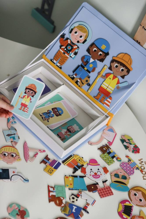 Zestaw Zawody z bestsellerowej linii Magnetibooków zawiera 64 kolorowe magnesy z częściami ciała (głowy, tułowia, nogi), elementami strojów służbowych i charakterystycznymi detalami (jak szpadel, poziomica czy hydrant), potrzebnymi do stworzenia przedstawicieli różnych zawodów, w tym m.in. piekarza, policjantki, listonoszki, piłkarza, astronauty, opiekunki do dzieci czy lekarza. Dołączone karty z ilustracjami ułatwiają dobór odpowiednich komponentów i można się na nich wzorować. Magnesy pozwalają również na ułożenie zupełnie nowych, wymyślonych przez siebie postaci. To świetna rozrywka dla małych obserwatorów i miłośników podglądania wszelkich prac, wykonywanych przez dorosłych, a także wszystkich twórczych dzieci.