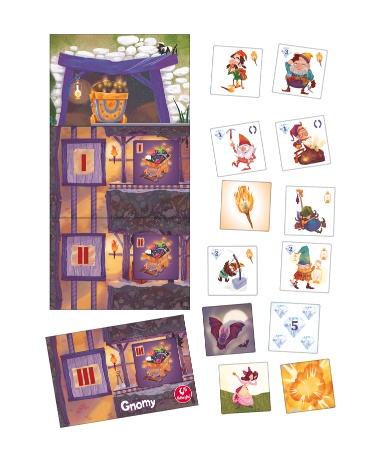 (SK) Gnómovia - Ako skupina gnómov sa vydáte do bane hľadať vzácne diamanty. Musíte si dávať pozor na tmu, konkurenčné gangy, lietajúce netopiere, výbuchy a početné krádeže. Hra obsahuje: - 72 dlaždičiek - hracie pole - návod. (RO) Gnomi - Faci parte din echipa gnomilor. Plecați în mină, în căutarea diamantelor prețioase. Trebuie să aveți grijă la întuneric, bandele concurente, liliecii zburători, explozii și la numeroasele furturi.