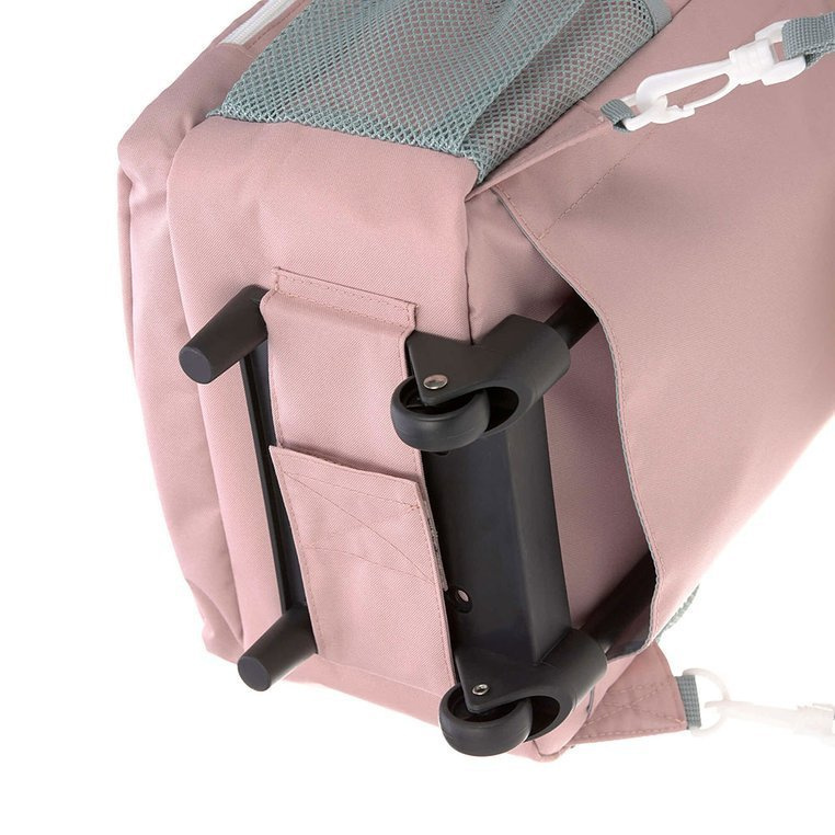 Walizka i plecak na kółkach 2w1 niemieckiej marki LASSIG to praktyczny, wielofunkcyjny gadżet, idealny zarówno do przedszkola czy szkoły, jak i na wycieczkę czy nawet wakacyjny wyjazd. Stelaż z kółkami posiada wysuwaną rączkę z regulacją wysokości, dzięki czemu można go łatwo dopasować nawet do wzrostu małego dziecka. Stelaż ten jest ponadto demontowany w kilku prostych krokach, co pozwala zamienić walizkę na typowy plecak do noszenia na plecach – ma on wygodne szerokie i miękkie ramiona z regulacją długości i odblaskami, a oprócz pojemnej kieszeni głównej, mieszczącej format A4 z wizytówką na podszewce, na której można zapisać imię dziecka i numer kontaktowy rodzica, także zapinaną na suwak zewnętrzną kieszonkę z przodu – z pyszczkiem szynszyli i sporymi uszami – oraz dwie boczne kieszenie z siatki. Plecak/walizka ma piękny pasteloworóżowy kolor, białe suwaki i szarobłękitne detale (podszewka, siatkowe kieszonki, uszko do zawieszania plecaka, np. na haczyku w szatni). Stelaż jest czarny. Materiał plecaka łatwo się czyści i jest odporny na wilgoć.