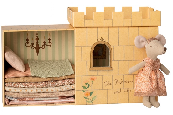 W zestawie znajduje się piękny kartonowy zamek z wieżyczką, miękkie materace ułożone jeden na drugim, ukryte ziarnko grochu oraz urocza myszka–księżniczka w eleganckiej sukience. Zabawka została wykonana z dbałością o najmniejsze detale, typową dla marki Maileg, co czyni ją idealną zarówno do zabawy, jak i kolekcjonowania.
