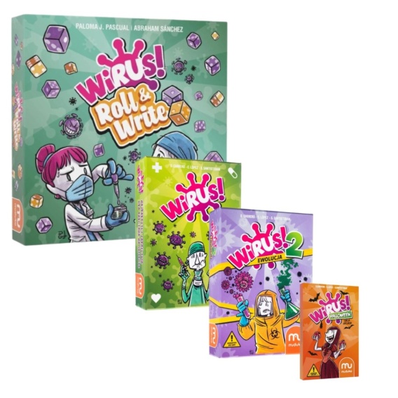 Zanurz się w świat emocjonującej rywalizacji, naukowych eksperymentów i niebezpiecznych patogenów! Ten zestaw to prawdziwa gratka dla fanów kultowej serii Wirus! — znajdziesz w nim aż cztery gry, które razem tworzą pełne doświadczenie: od klasycznej karcianki, przez dodatki tematyczne, aż po nową, kościaną odsłonę.