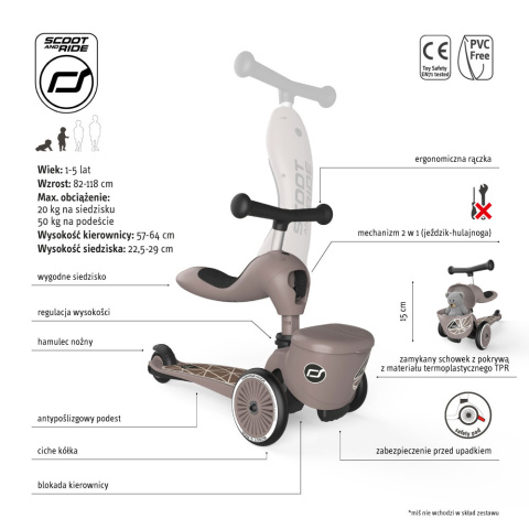 • SCOOTANDRIDE Highwaykick 1 Lifestyle 2w1 Jeździk i hulajnoga z zamykanym schowkiem 1-5 lat | Brown Lines