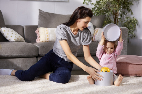 - Schowaj Leonarda, na przykład pod kocem, a ten zacznie nawoływać dziecko do znalezienia go. Najlepiej chować zabawkę za każdym razem w innym miejscu (w pudełku, szufladzie, albo gdziekolwiek indziej), urozmaicając w ten sposób zabawę