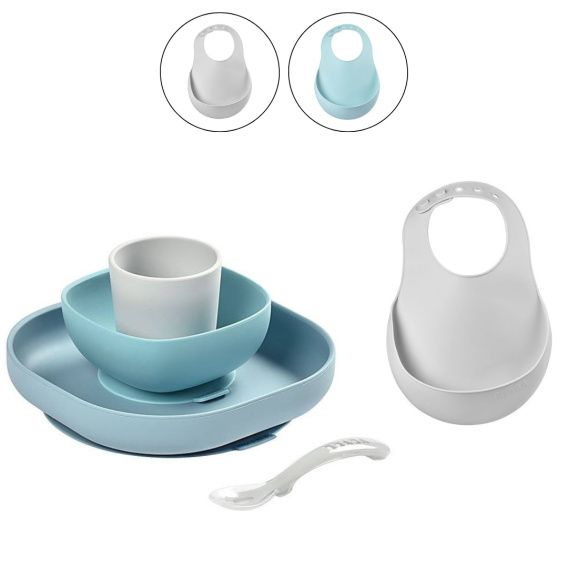 Komplet naczyń z silikonu francuskiej marki BEABA składa się z talerzyka, miseczki, kubka i łyżeczki treningowej. Wszystkie elementy zestawu charakteryzuje ergonomiczny, zaokrąglony kształt i miękkie, gładkie brzegi. Wyższe boki miseczki i talerzyka ułatwiają dziecku samodzielne nabieranie posiłku na widelec czy łyżkę. Naczynia te mają na spodzie antypoślizgową przyssawkę, dzięki czemu są stabilne i dobrze trzymają się stołu. Kubeczek jest poręczny i wygodny do nauki picia, a łyżeczka idealnie dopasowuje się do dziecięcej buzi i można ją odłożyć tak, by główka nie dotykała powierzchni, dzięki czemu jej używanie jest o wiele bardziej higieniczne.