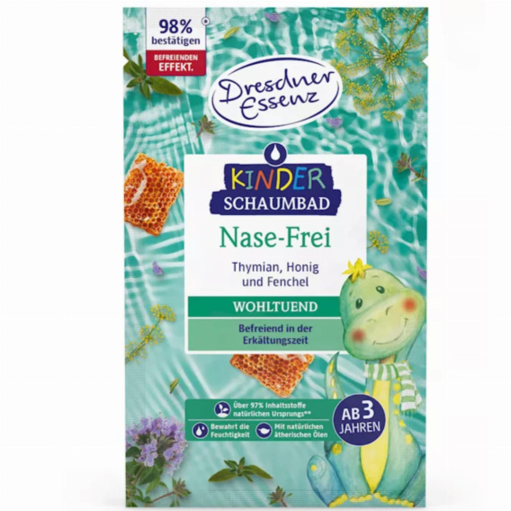 DRESDNER ESSENZ Płyn kąpieli ODDYCHAJ SWOBODNIE to idealny produkt dla dzieci w wieku 3 lat i starszych, który działa kojąco w zimnych porach roku. Jego cenna formuła oparta na naturalnym olejku eterycznym z tymianku i kopru włoskiego oraz miodzie poprawia ogólne samopoczucie dziecka.