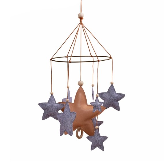 Urocza i stylowa muzyczna karuzela z gwiazdkami, idealna do zawieszenia nad dziecięcym łóżeczkiem czy kołyską. Kiedy pociągniesz za sznurek największej gwiazdki grać będzie piękna kołysanka. Karuzela wykonana ręcznie z filcu i skóry. Zapakowana w piękne pudełko, idealne na prezent.