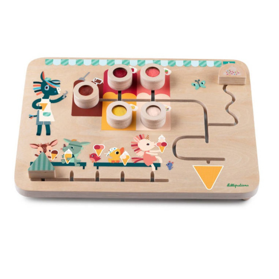 Drewniany labirynt sensoryczny Lodziarnia marki Lilliputiens to idealna zabawka edukacyjna dla maluszków od 18. miesiąca życia.Tablica przedstawia kolorową lodziarnię, gdzie dzieci mogą komponować własne desery lodowe, przesuwając klocki-lodowe kulki po specjalnych torach. Zabawa polega na odtwarzaniu zamówień gości, dopasowując smaki i kolory lodów do postaci.