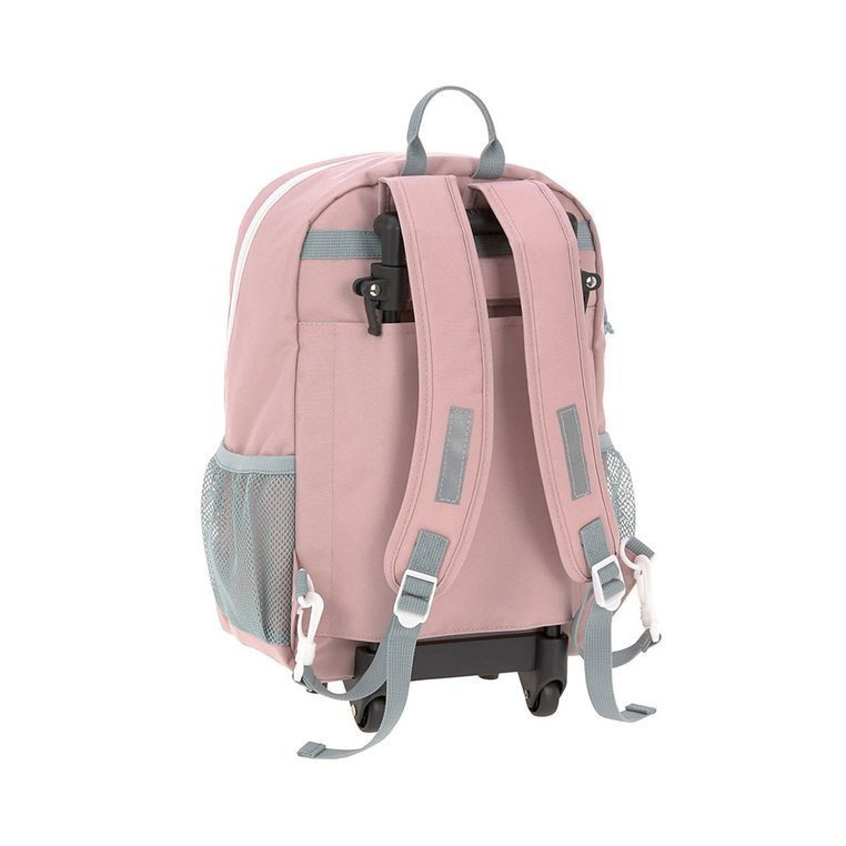 Walizka i plecak na kółkach 2w1 niemieckiej marki LASSIG to praktyczny, wielofunkcyjny gadżet, idealny zarówno do przedszkola czy szkoły, jak i na wycieczkę czy nawet wakacyjny wyjazd. Stelaż z kółkami posiada wysuwaną rączkę z regulacją wysokości, dzięki czemu można go łatwo dopasować nawet do wzrostu małego dziecka. Stelaż ten jest ponadto demontowany w kilku prostych krokach, co pozwala zamienić walizkę na typowy plecak do noszenia na plecach – ma on wygodne szerokie i miękkie ramiona z regulacją długości i odblaskami, a oprócz pojemnej kieszeni głównej, mieszczącej format A4 z wizytówką na podszewce, na której można zapisać imię dziecka i numer kontaktowy rodzica, także zapinaną na suwak zewnętrzną kieszonkę z przodu – z pyszczkiem szynszyli i sporymi uszami – oraz dwie boczne kieszenie z siatki. Plecak/walizka ma piękny pasteloworóżowy kolor, białe suwaki i szarobłękitne detale (podszewka, siatkowe kieszonki, uszko do zawieszania plecaka, np. na haczyku w szatni). Stelaż jest czarny. Materiał plecaka łatwo się czyści i jest odporny na wilgoć.