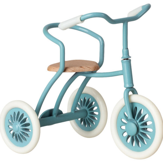 Mały trójkołowy rowerek dla laleczek, myszek i króliczków Maileg. Trycykl wykonany jest z metalu, drewna i gumy. Zapakowany w piękne pudełko
