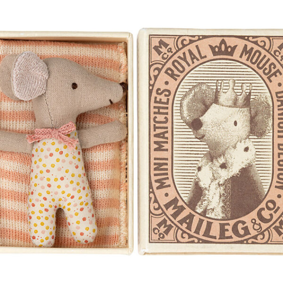 Mała śpiąca myszka to kolejna postać należąca do uroczej rodzinki myszek Maileg. Maluszek schowany jest w pudełku po zapałkach. W zestawie znajduje się także śpiworek w urocze paski.