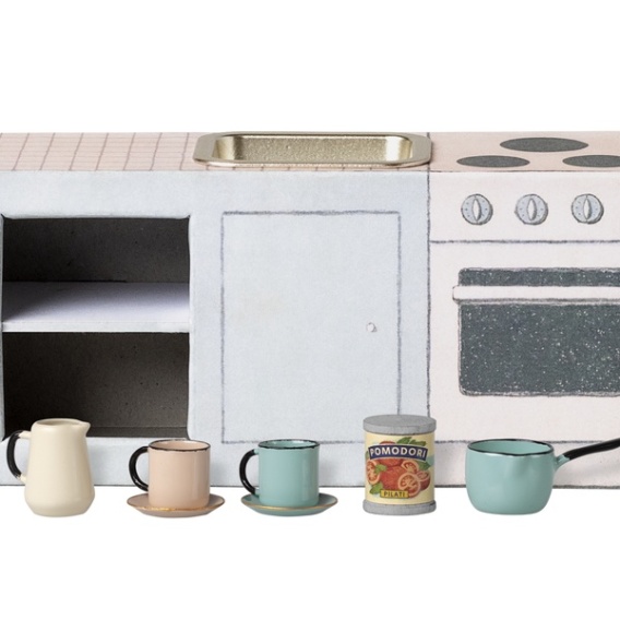 Ten kuchenny zestaw zachęca dzieci do kreatywnej zabawy, tworzenia własnych historyjek i odgrywania scenek z życia codziennego. Doskonale komponuje się z pozostałymi mebelkami i akcesoriami Maileg, tworząc klimatyczny i pełen uroku świat miniaturowych myszy.