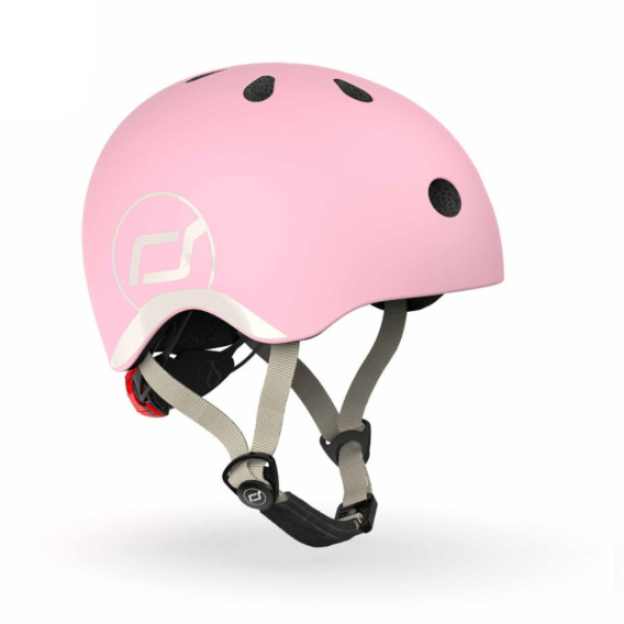 • kask jest spójny kolorystycznie z pastelową kolekcją Highwaykick – po bokach bladoróżowej skorupy (w kolorze Rose), znajdują się beżowoszare (w kolorze Ash) grafiki z logo Scoot&Ride, w tym samym kolorze są również taśmy regulujące