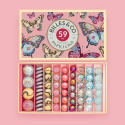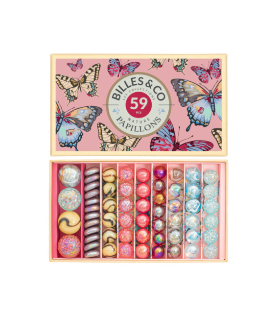 Przenieś się do zaczarowanego ogrodu, gdzie przepiękne gatunki motyli fruwają wokół, skrywając swoje tajemnice. Zestaw Billes&Co RÓŻOWE MOTYLE to 59 szklanych kulek i kamyczków, które zachwycą Cię swoimi kolorami i wzorami. Każda kulka jest starannie ułożona tematycznie, tworząc małe, magiczne uniwersa w pięknie zdobionym pudełku.