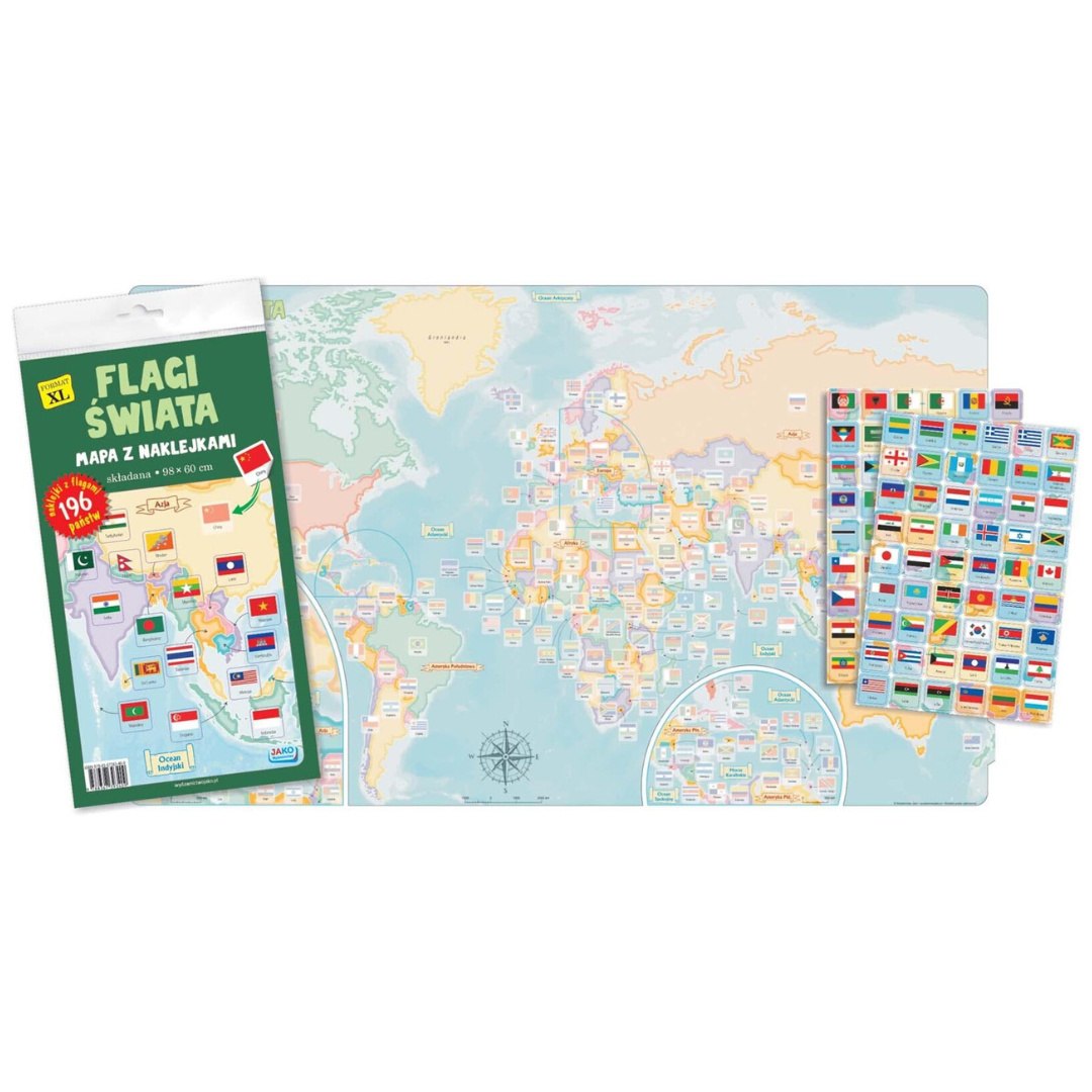 Nagroda Rodziców Wielka, kolorowa mapa świata z naklejkami flag – świetna forma nauki geografii, państw i ich symboli. Rozbudza ciekawość świata u dzieci.