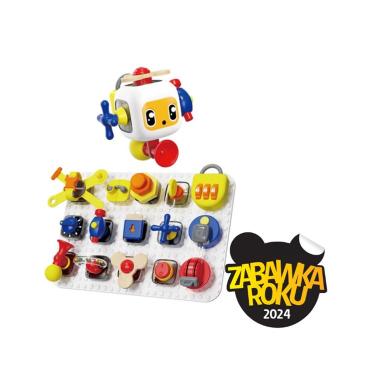 Zabawka Roku Bogata sensorycznie tablica 5w1 z kostką, która rozwija motorykę małą, logiczne myślenie i koordynację. Stworzona z myślą o małych odkrywcach i rączkach.
