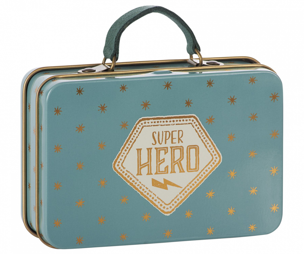 Metalowa walizeczka w kolorze niebieskim z nadrukiem SUPERHERO i w złote gwiazdki.