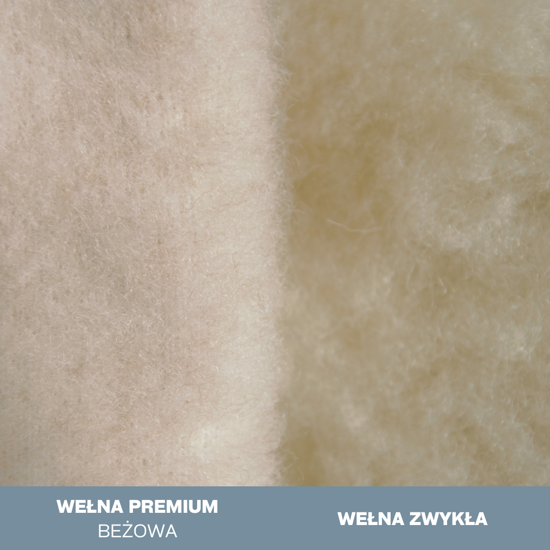 Naturalna mięciutka owcza wełna premium idealnie sprawdza się na każdą porę roku. Zapewnia jeszcze lepszą naturalną termoregulację oraz posiada właściwości antyalergiczne i jest odporna na rozwój roztoczy. Posiada właściwości higieniczne i samoczyszczące, jak również neutralizuje nieprzyjemne zapachy i zabrudzenia.